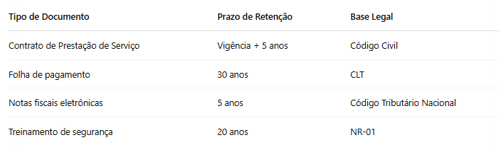 Diversas legislações exigem que documentos sejam mantidos por períodos específicos. Por exemplo: